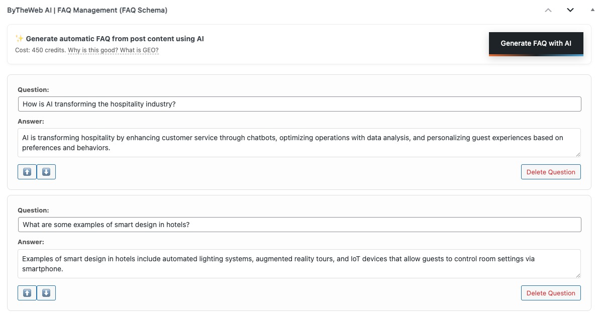- Automatically AI generate FAQ suggestions based on the existing page/post content