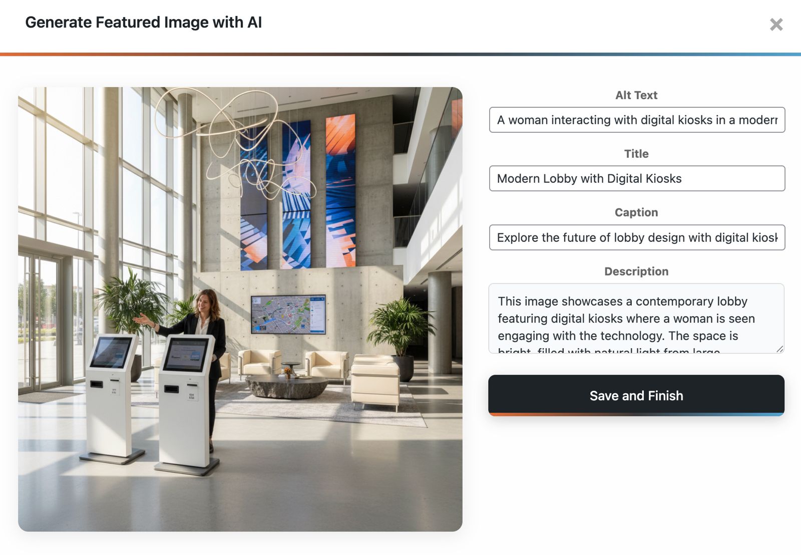 - Generate a realistic featured image based on an AI-prepared description (editable before generation)
