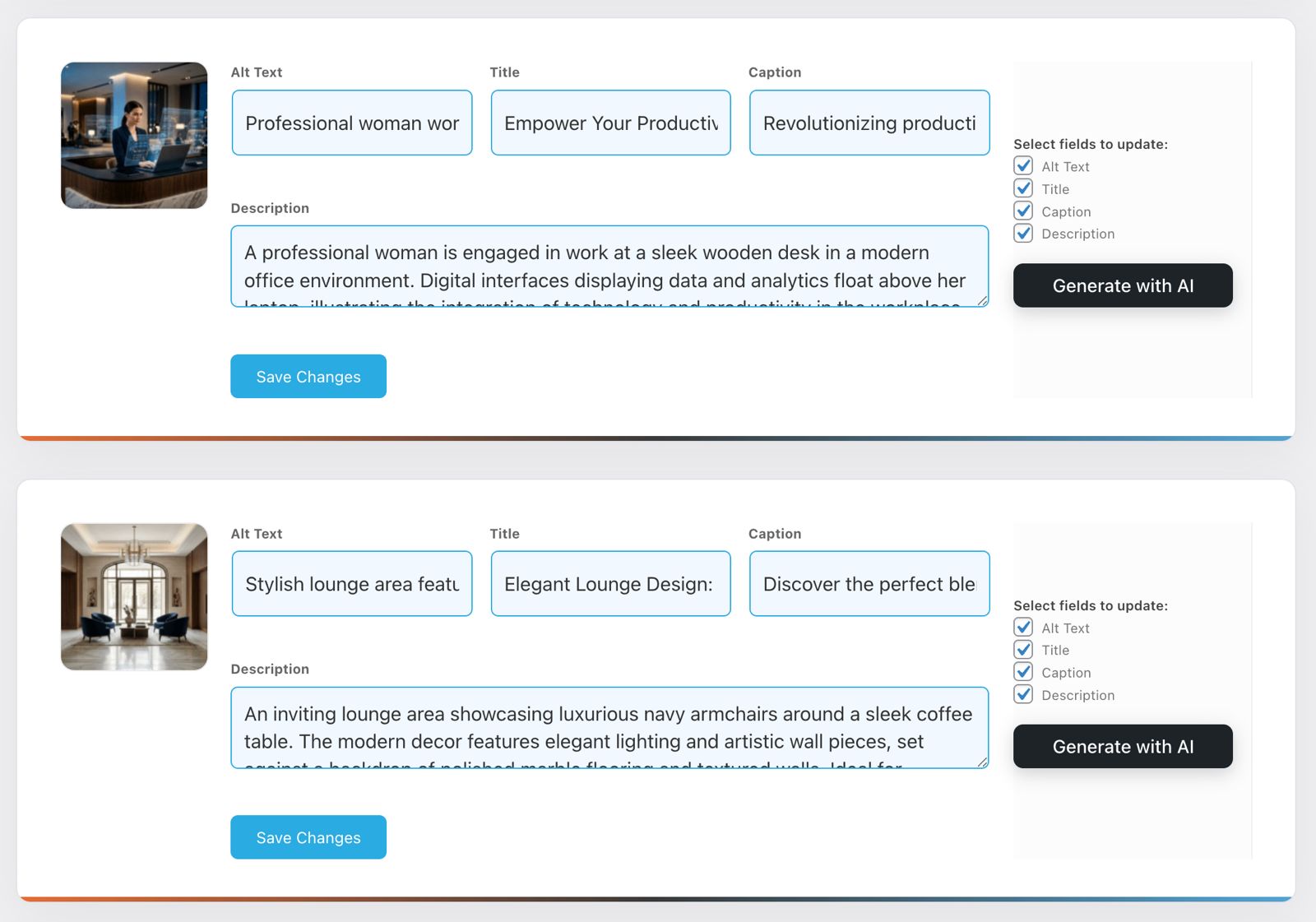 - Quickly review and manage key image fields (Alt, Title, Caption, Description)