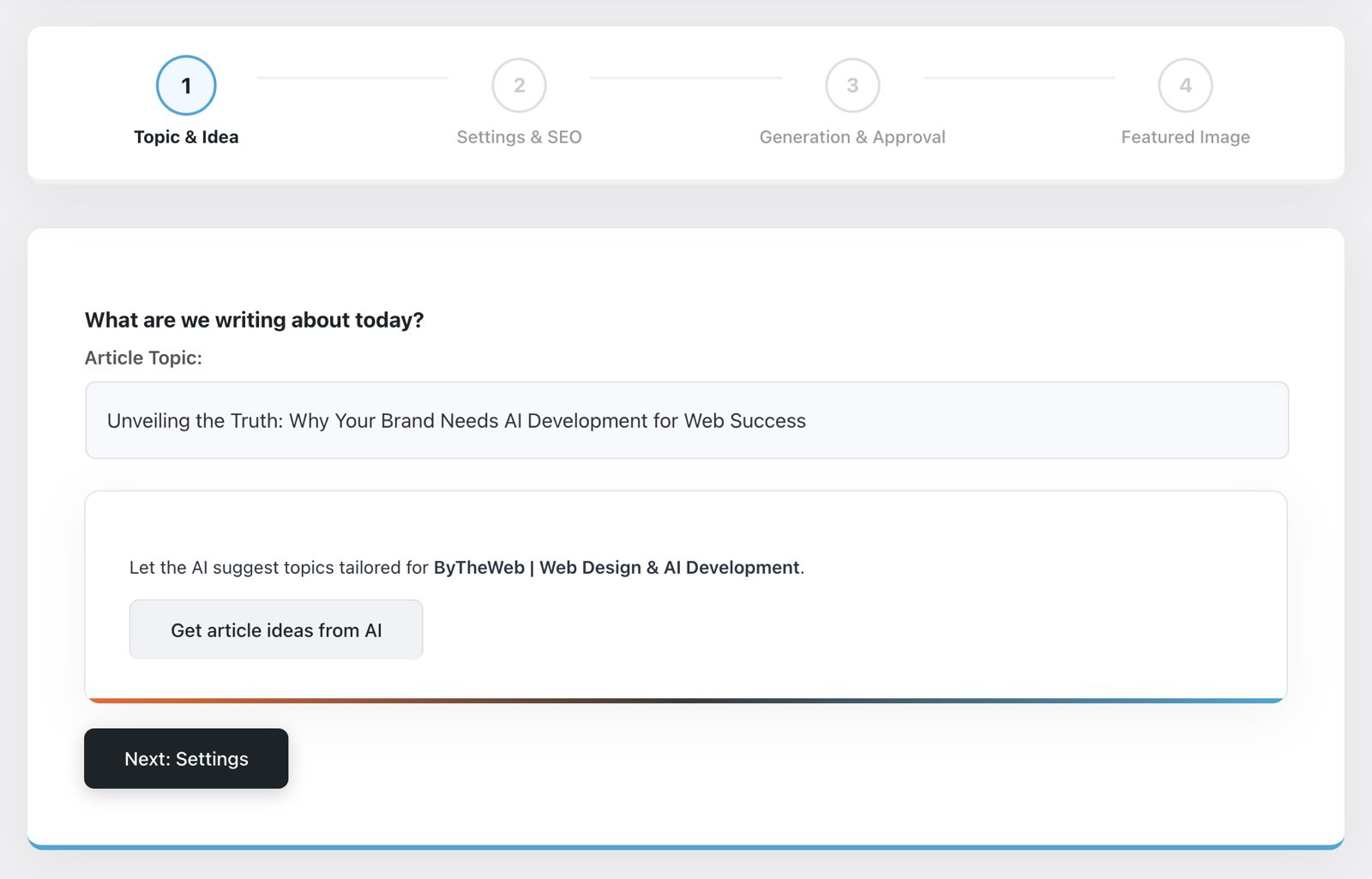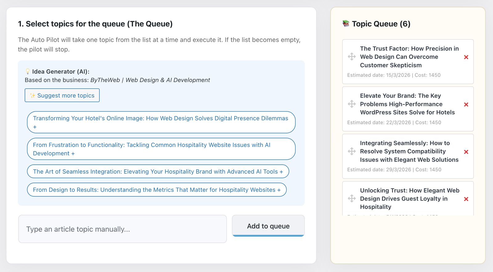- Automated article creation using the same guided workflow as the AI Article Wizard