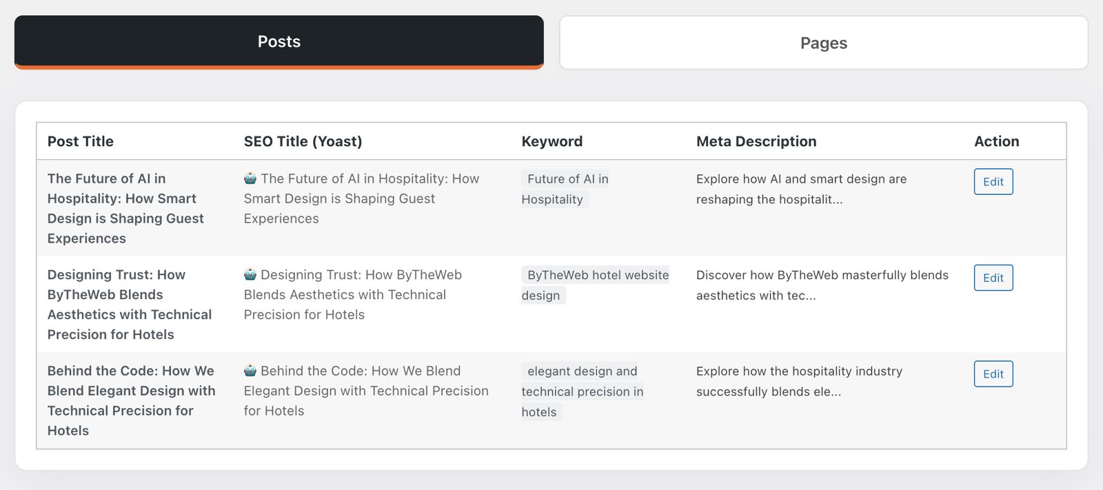- Centralized audit table for Yoast SEO fields (Title / Focus Keyword / Meta Description)