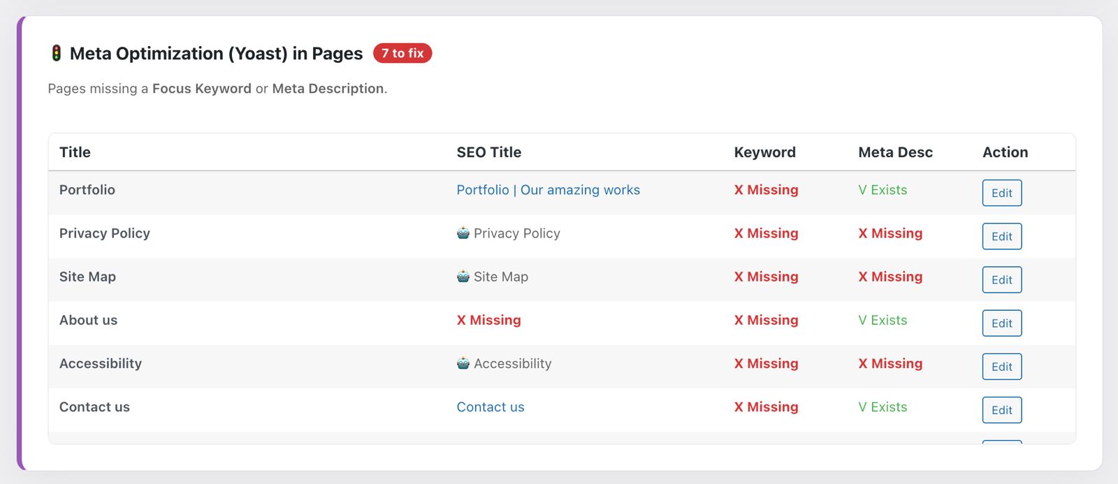 - Quickly identify missing SEO titles, focus keywords, and meta descriptions